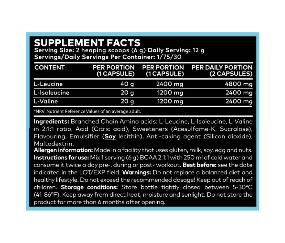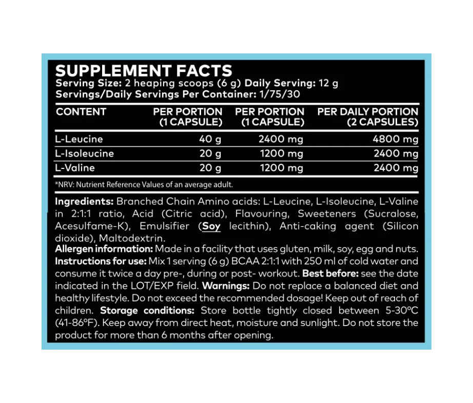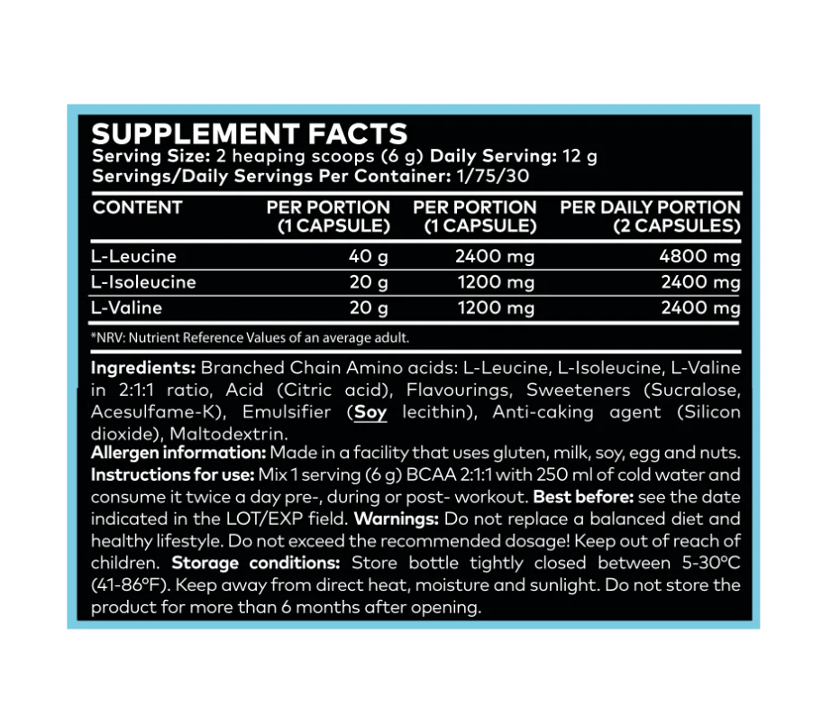 Instructions for Use: Mix 1 serving (6 g) BCAA 2:1:1 with 250 ml of cold water and consume it twice a day, pre-, during, or post-workout.