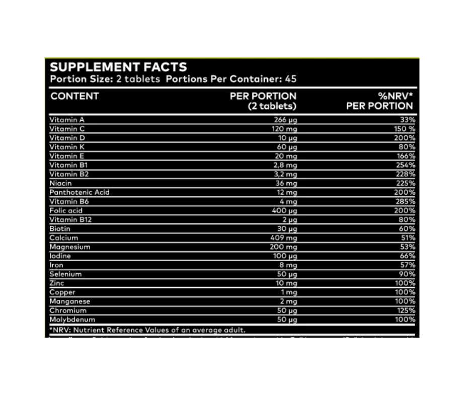 Bulking agent (Cellulose), Calcium carbonate, Calcium salts of orthophosphoric acid, Magnesium oxide, L-ascorbic acid, Coating agents [Glazing agent (Polyvinyl alcohol), Colours (Calcium carbonate, Indigo carmine, Carmine)], Anti-caking agent (Talc), Emulsifier (Mono- and Diglycerides of fatty acids), DL-alpha-tocopheryl acetate, Nicotinamide, Ferrous fumarate, D-pantothenate calcium, Zinc oxide, Manganese sulphate, Pyridoxine hydrochloride, Cholecalciferol, Cupric sulphate, Thiamin hydrochloride, Riboflavin, Retinyl acetate, Cyanocobalamin, Phylloquinone, Chromium picolinate, Pteroylmonoglutamic acid, Potassium iodide, Sodium molybdate, Sodium selenite, D-biotin.
