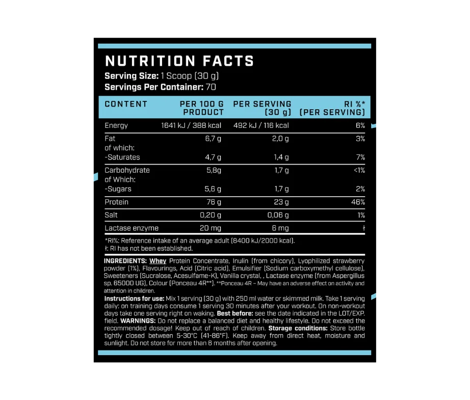 JUSTFIT HARDCORE PREMIUM WHEY 2100g contains 22g of high-quality protein per serving, designed to support muscle growth, maintenance and recovery. This premium protein blend is enriched with the digestive enzyme lactase to aid digestion and nutrient absorption, making it ideal for athletes and fitness enthusiasts looking for a post-workout formula.