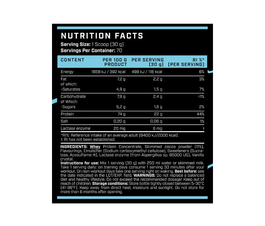 Whey protein concentrate, skimmed cocoa powder (11%), flavors, emulsifier (sodium carboxymethyl cellulose), sweeteners (sucralose, acesulfame-K), lactase enzyme (from Aspergillus sp. 65000 UG), vanilla crystal