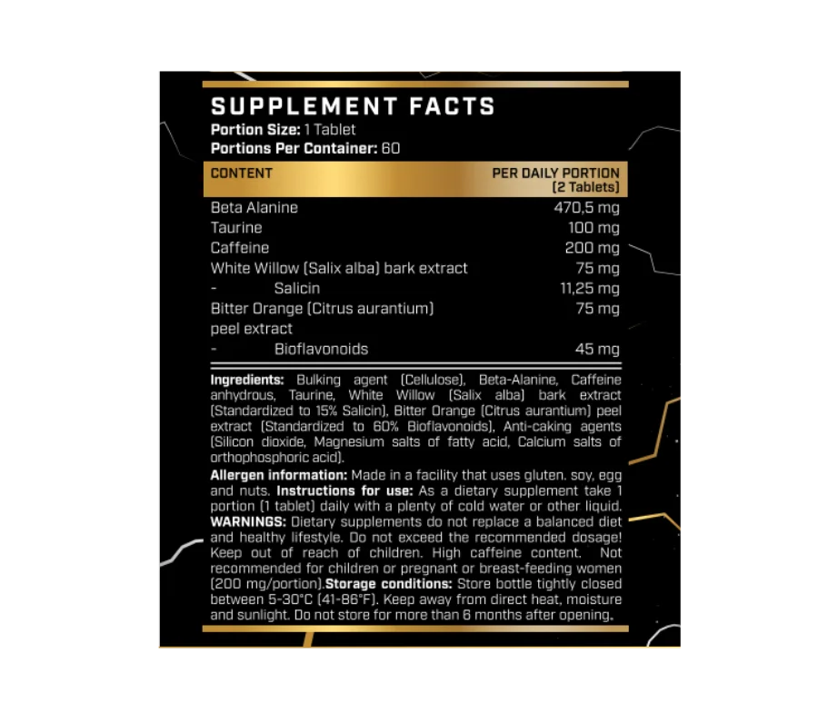 Bulking agent (Cellulose), Beta Alanine, Caffeine anhydrous, Taurine, White Willow (Salix alba) bark extract (Standardized to 15% Salicin), Bitter Orange (Citrus aurantium) peel extract (Standardized to 60% Bioflavonoids), Anti-caking agents (Silicon dioxide, Magnesium salts of fatty acids, Calcium salts of orthophosphoric acid).
