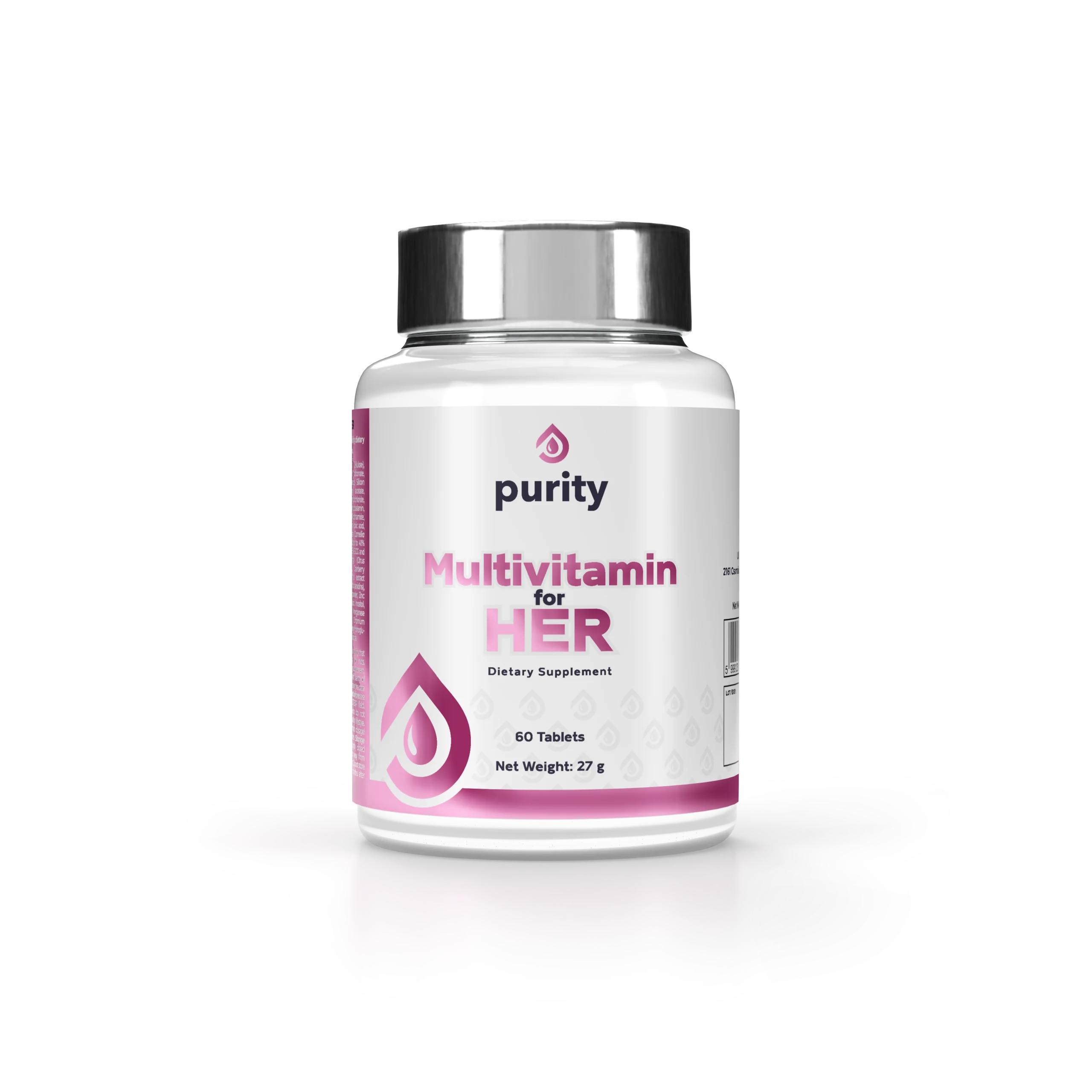 PURITY MULTIVITAMIN FOR HER is a carefully formulated blend of essential vitamins, minerals, antioxidants, and botanicals, specifically designed to meet the unique needs of women. This luxurious supplement supports energy production, immunity, skin health, and overall well-being. With 23 key nutrients, including Vitamin B-complex, Vitamin C, Zinc, Iron, and botanical extracts like Green Tea, Cranberry, and Spirulina, it ensures that women maintain optimal health and vitality.